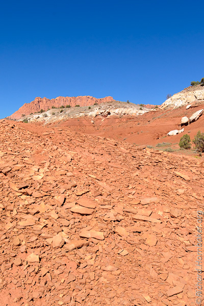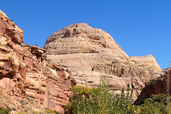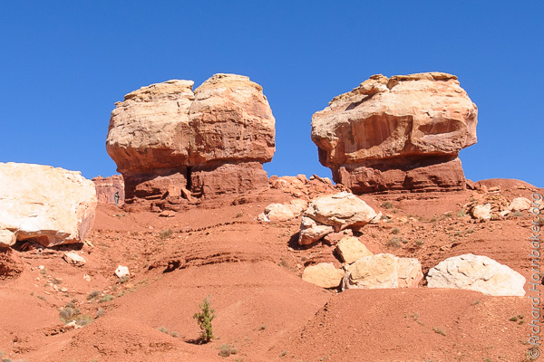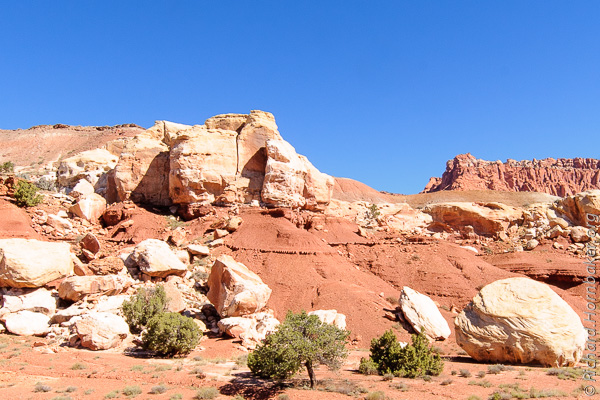 Near the entrance, it wasn’t obvious how Capitol Reef got its name, but we were fascinated by the contrast in rocks.  A deep red base topped by very white boulders.