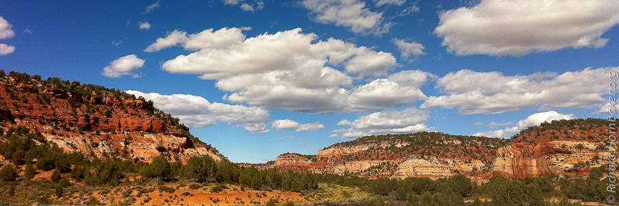 Between Kanab, UT and Zion were some very scenic landscapes. If only these clouds had followed us into Zion! Later, we would gain a strong appreciation for having clouds in the shot – they make a huge difference in the impact of an image.