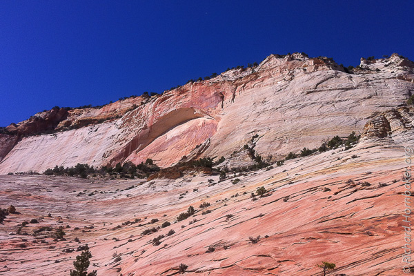 Something that struck me was the contrast in landscapes; it’s like the park has two personalities. At the northeastern entrance, the stone is mostly white with sparse brush; suddenly, it transitions to a dark reddish-brown stone with evergreen trees. And the strata in the stone isn’t horizontal – it points in all different directions; geologists believe this is because it originated as giant sand dunes that became compressed and infused with minerals.